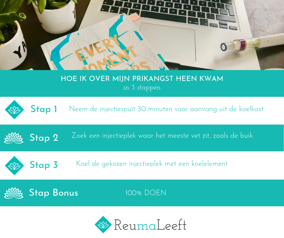 Als je bovenstaande stappen hebt gezet, is de enige belemmeringen nog het doen. Door niet te lang te wachten en de stappen rustig te doorlopen, lukt het mij om de injectie zelf te zetten. Hoe langer je wacht, hoe hoger de drempel wordt en hoe minder effectief voorgaande stappen zijn. Bedenk ook dat elke keer dat jezelf de injectie zet, het steeds minder moeilijk wordt!