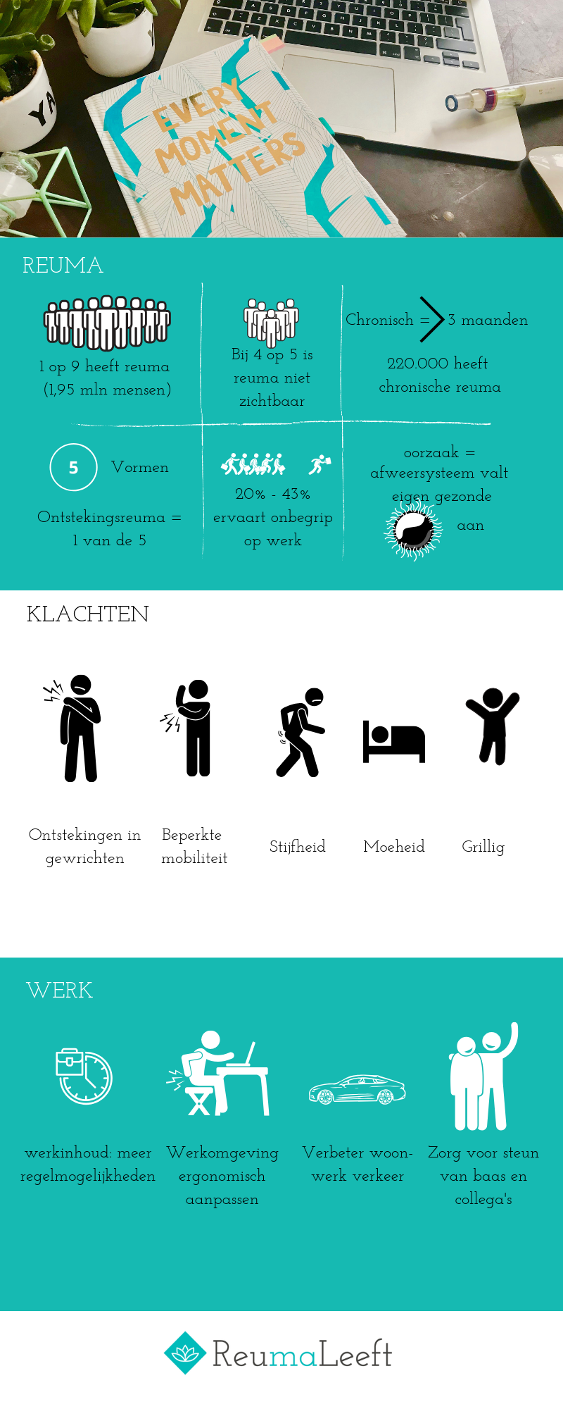 Ik ben Reumaleeft dan ook begonnen om anderen te helpen in dit proces. Mijn missie is om het onbegrip te verminderen en de acceptatie te vergroten, zodat het re-integratieproces meer gefocust is op de reële mogelijkheden van de medewerker met reuma. Ik hoop dat door meer inzicht te geven in hoe het is om met reuma te leven en door kennis en informatie over reuma en re-integratie te delen, een ander in dezelfde situatie een betere grip krijgt op het proces en de omgeving. Zorg dus dat je zelf goed op de hoogte bent van je eigen ziektebeeld, je eigen aandeel hierin en de wetgeving. Zodat je je omgeving kunt meenemen in jouw verhaal. Informeer anderen om zo meer begrip en erkenning te krijgen. Op deze manier laat je reuma niet jouw leven leiden, maar bepaal jij je eigen koers.