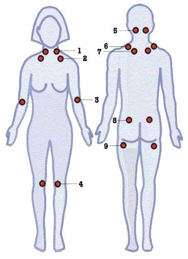 Bij fibromyalgie dienen tenminste 11 van de 18 tenderpoints in het lichaam pijnlijk te zijn (zie afbeelding 1). Deze tenderpoints zitten niet alleen in de schouder, bekken en nek, maar ook in de knieën en ellebogen. Tenderpoints zijn drukpunten in het lichaam die heel pijnlijk zijn. Soms voel je er een spierknobbel of een pijnlijke verharding (Bijlsma & van Laar, 2013; NVR, 2003; Putten & Huijbrechts, 2019).
