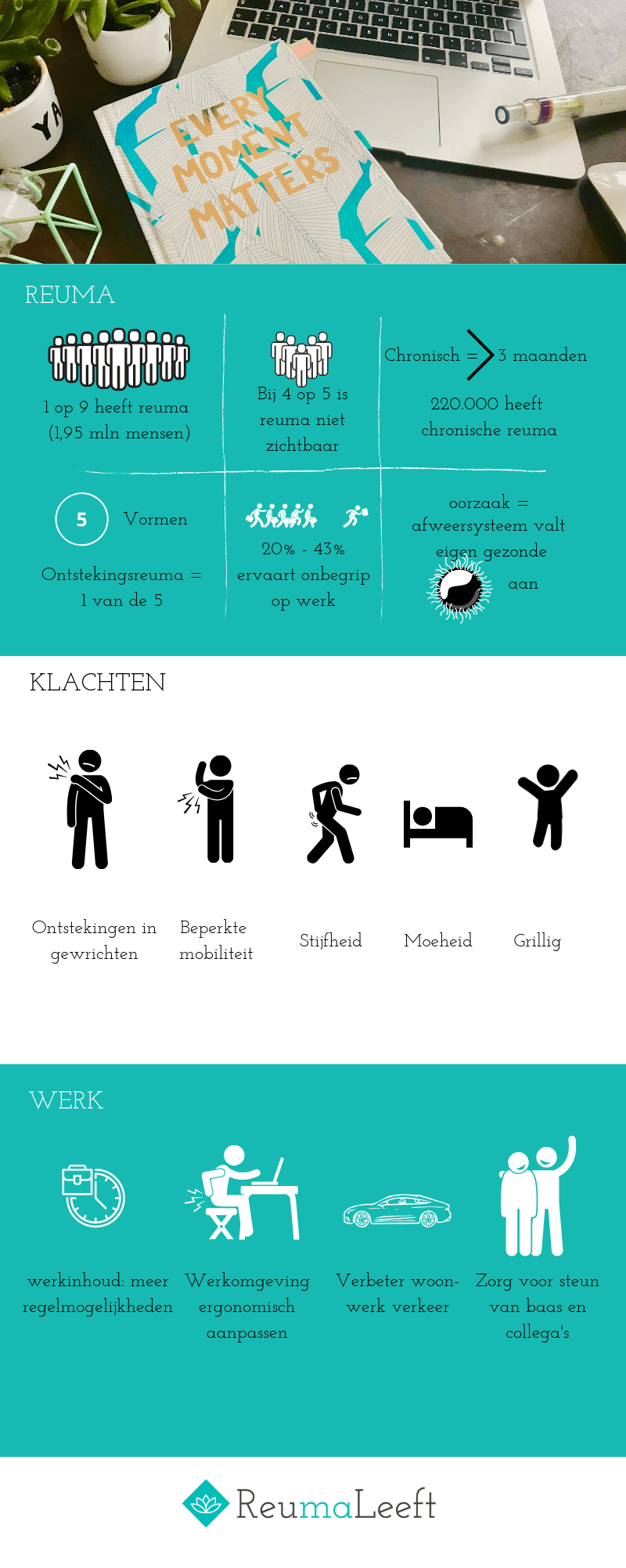 Om je hiermee een handje te helpen, heb ik al een presentatie voor je gemaakt. Zodat je dit niet zelf hoeft te doen. Gebruik de blogs van ReumaLeeft ter ondersteuning van deze presentatie! In de presentatie komen de volgende blogs terug: algemene informatie over reuma, behandelingen, klachten en invloed reuma op je werk en welke aanpassingen hierin nodig kunnen zijn. De laatste sheet gaat over steun en begrip krijgen van je collega’s!